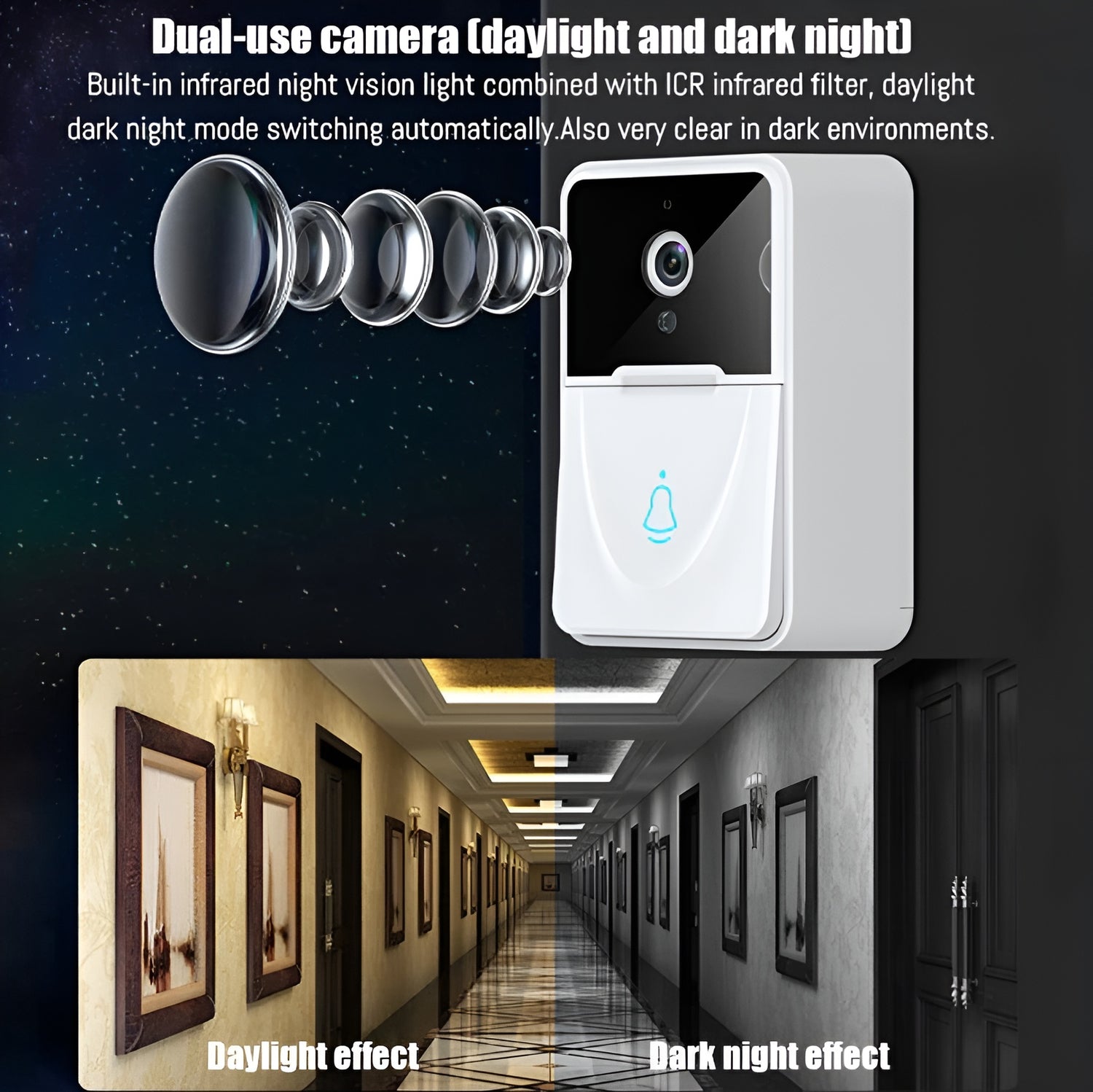 - Stay connected and secure with this WiFi Video Doorbell featuring HD camera, real-time alerts, two-way audio, and night vision. Easy to install, compatible with smartphones, and perfect for home security.