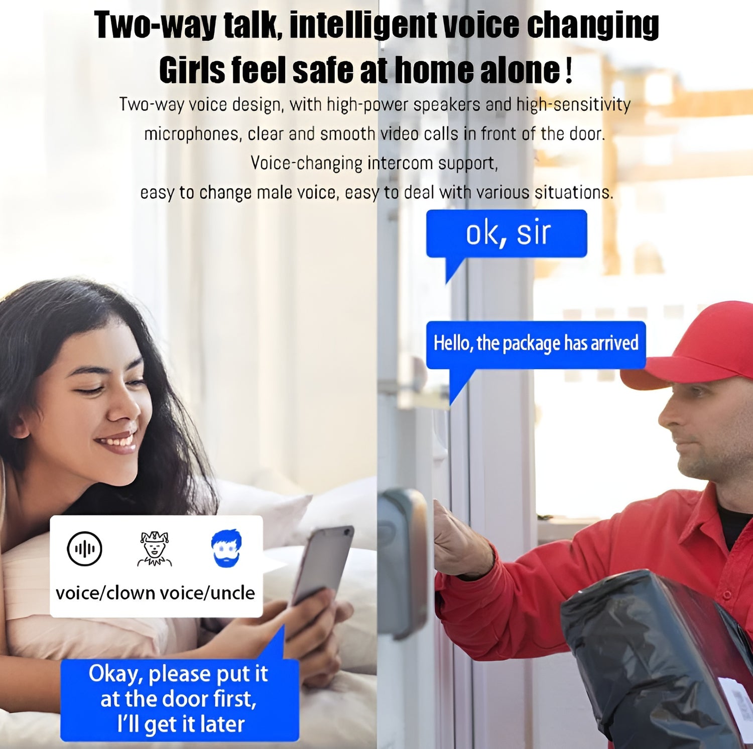Our Smart WiFi Video Doorbell lets you see, talk, and even change your voice in real time. Whether it’s a delivery or an unexpected visitor, stay in control and secure from anywhere.